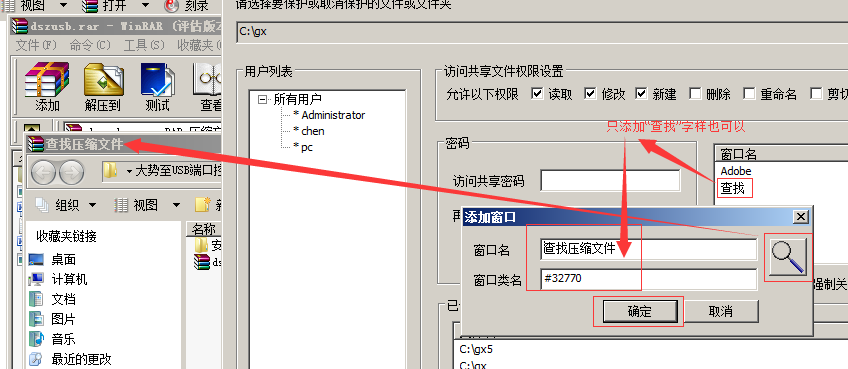 然后在这里增加描述即可,你既可以手工输入,例如禁止客户端打开Winrar的”文件“里面的”查找压缩文件“,由于其窗体名称里面还有”查找“字样,所以您可以直接在”窗口名“这里添加”查找“字样,然后点击“确定”即可,或者你可以点击“放大镜”然后移动到打开的”查找压缩文件“对话框顶部,这样程序将自动获取窗口名和类名并自动添加到窗体里面,然后你点击”确定“即可成功加入。同时,客户端还需要关闭共享文件列表框,然后再次打开即可加载生效。如下图所示: