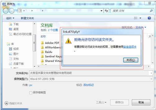 如果您通过客户端打开加密保护后的共享文件,并进行了修改之后,如果有如下提示:“你当前无权访问此文件夹”