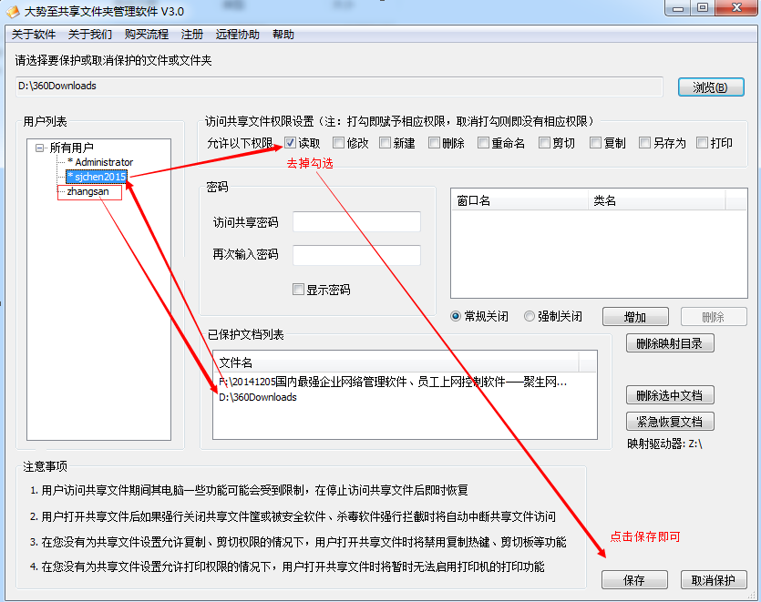 同时,如果你不想让你新添加的访问特定共享文件的用户访问其他共享文件夹,则您可以选中其他已经保护的共享文件夹,然后选择你刚才添加的用户,然后取消勾选访问权限的“读取”权限即可。这样就彻底实现了特定共享文件夹只让特定用户访问的功能。例如,我们增加了对一个文件夹“360Downloads”的保护,并且为其创建了一个特定用户“zhangsan”访问,但是先前系统自带的账号同样也有访问这个“360Downloads”共享文件的权限,这个时候如果我们不想让系统自带的账号访问,则我们可以在“已保护文档列表”中选择“360Downloads”这个文件夹,然后在选择相应的系统自带的账户,然后在访问权限哪里取消勾选“读取”,并点击右下角的“保存”即可,这样就实现了“360Downloads”这个文件夹只能被zhangsan这个用户访问的功能,其他账号就无法访问了,如下图所示: