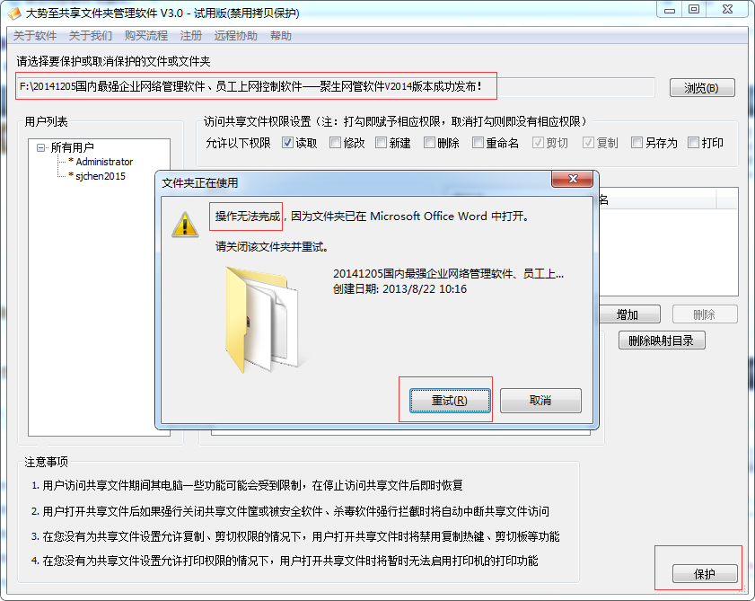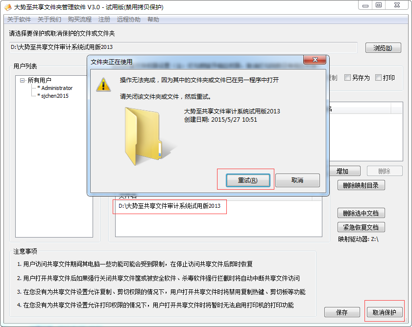 出现这种情况,一般是被保护的文档正在使用过程中,这时候如果想取消此文档,则一方面需要停止对此保护文档的访问(客户端需要完全关闭已经打开的共享文件列表框);另一方面也可以点击“重试”,然后强行中断用户对共享文档的访问。如果点击“重试”依然无法成功取消对共享文档的保护,则可以关闭“大势至共享文件夹管理软件”,然后再次打开再次选中被保护的共享文档再次尝试取消保护,一般均可成功取消保护,如下图所示: