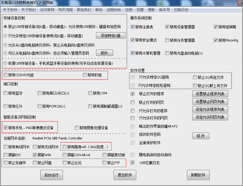 图:禁止U盘软件同时也可以禁止邮件附件、禁止网盘、屏蔽论坛