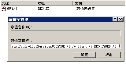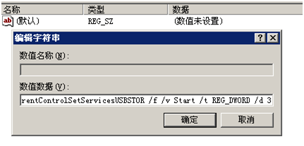 用同样的方法在启用U盘右窗口处,只要在“数值数据”中输入“REG ADD HKLMSYSTEMCurrentControlSetServicesUSBSTOR /f /v Start /t REG_DWORD /d 3”