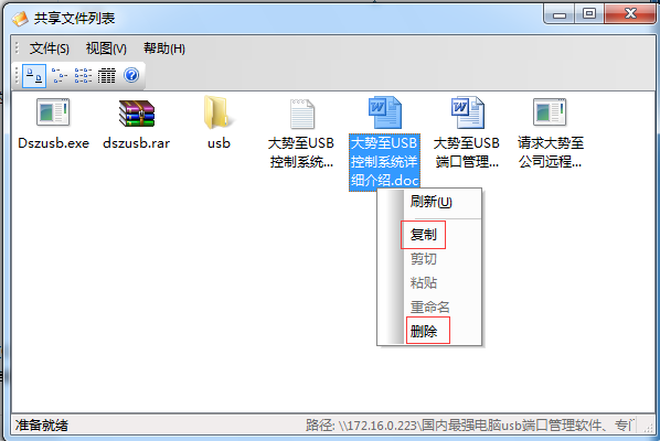 例如有一款“大势至共享文件夹管理软件”(下载地址:http://www.grablan.com/gxwjjm.html),通过将服务器或电脑上的共享文件进行加密之后,局域网用户访问共享文件的时候将以一种“EXE”的方式打开,并且是在特定的共享文件列表框内打开、读取,这样就可以轻松复制将共享文件另存为本地的行为。同时,还可以通过“大势至共享文件夹管理软件”来限制共享文件的访问权限,例如只可以读取共享文件而禁止另存为本地、禁止打开共享文件后复制其内容(例如,虽然打开一篇Word之后,即便只有只读权限,依然还是可以复制其内容的)、禁止打印共享文件;同时,也可以禁止修改共享文件、禁止剪切共享文件、禁止重命名共享文件等。通过上述对共享文件的访问控制,可以极大地保护共享文件的安全,保护单位无形资产和商业机密。如下图所示: