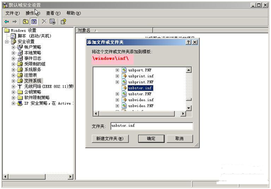 右键点击“添加文件”,弹出“添加文件和文件夹”,在“文件夹”栏输入“%systemroot%\inf\usbstor.inf“,确定;