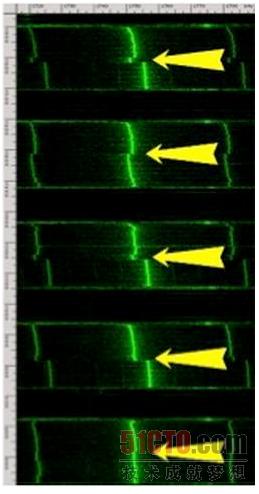 “很容易看出,每个解密的起始位置和结束位置(黄色箭头)。请注意每个解密运算中间的变化,覆盖几个频带。这是由于,在内部,每个GnuPG RSA解密都先取幂模秘密素数p,然后取幂模秘密素数q,我们就能看出这些阶段之间的差异。”