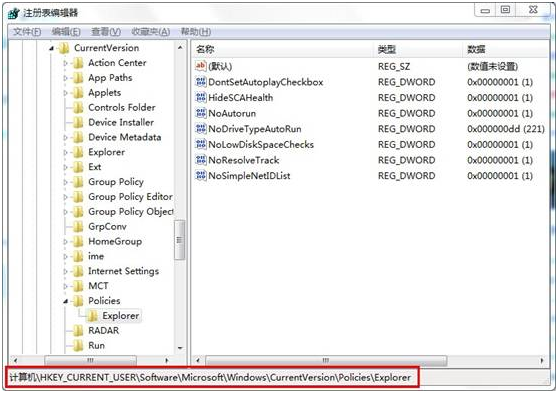 2.在打开的注册表编辑器中找到HKEY_CURRENT_USER\Software\Microsoft\Windows\CurrentVersion\Policies\Explorer键值。如下图所示