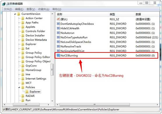 3.在右边界面空白处,右键新建 – DWORD32 命名为NoCDBurning。如下图所示