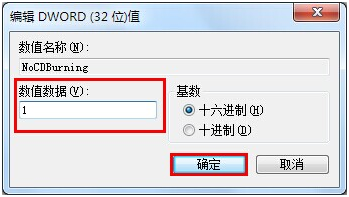 4.双击打开新建的NoCDBurning,修改键值为1,点击确定完成操作。如下图所示