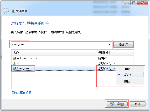 然后在“选择要与其共享的用户”下面的框内添加“everyone”账户,并点击后面的“添加”,这样就成功添加了“everyone”用户权限,也即局域网用户访问共享文件将不再需要输入密码,实现了匿名访问。同时,这里也可以分配“everyone”用户的权限,点击后面的下拉三角,然后这里可以选择“读取”、“读/写”,这样就分配了相应的共享文件访问权限了,然后点击下面的“共享”即可成功设置了共享,然后局域网用户就可以正常访问了。如下图所示: