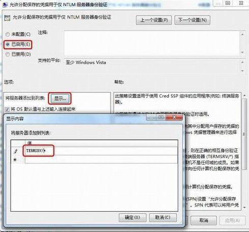 (3)在弹出的窗口中选中“已启用”,再单击“显示”,在弹出的窗口中,输入“TERMSRV/*”。(确保TERMSRV 为大写)