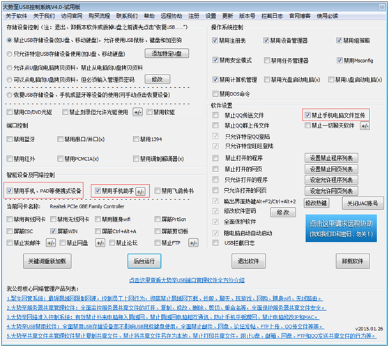 此外,通过“大势至USB端口控制软件”还可以禁用手机、Pad等便携设备、禁止手机电脑文件互传等,从而全面保护了电脑文件安全,防止无形资产和商业机密的泄露。同时,通过大势至USB屏蔽软件在禁止手机助手软件使用、禁止手机电脑文件互传、禁用手机的同时还不影响手机通过数据线连接电脑充电,从而实现了手机的精确管理。总之,要完全禁用手机助手、禁止安装手机助手以及阻止手机助手的运行,一方面需要熟悉手机助手软件的安装和运行等相关设置,通过合理的配置也可以阻止手机助手软件的运行;另一方面也可以借助第三方软件,强化对手机助手的使用控制和管理,从而达到完全阻止手机助手运行的目的,从而更好地保护电脑文件安全,防止通过第三方软件泄露的行为。