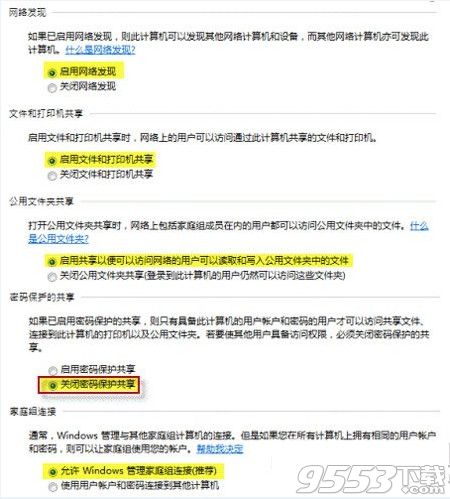 打开“控制面板网络和Internet网络和共享中心高级共享设置”,启用“网络发现”、“文件和打印机共享”、“公用文件夹共享”;“密码保护的共享”部分则请选择“关闭密码保护共享”。