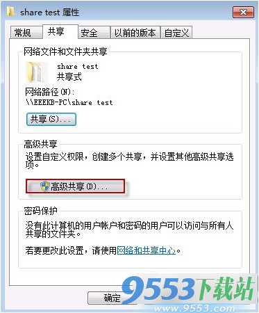 win7共享文件夹无法访问解决方法:点击“共享”标签,单击“高级共享”按钮。