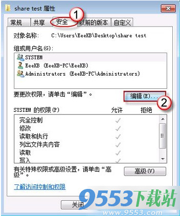 如果某文件夹被设为共享,它的所有子文件夹将默认被设为共享,在前面第二步中,我们已经关闭了密码保护共享,所以现在要来对共享文件夹的安全权限作一些更改。右键点击将要共享的文件夹,选择“属性”。在“安全”页上,单击“编辑”。