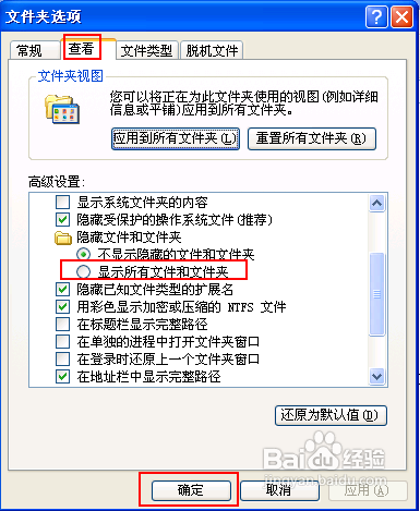 在打开的“文件夹选项”中选择“查看”标签,然后在高级设置--隐藏文件和文件夹中选择“显示隐藏的文件和文件夹”,点击确定即可。