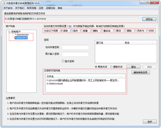 大势至共享文件夹加密软件的操作也比较简单。在顶部“请选择要保护或取消保护的文件或文件夹”,然后点击后面的“浏览”,选择要加密保护的文件,然后在左侧“用户列表”这里点击选择相应的用户,然后在右侧“设置共享文件访问权限”这里勾选要赋予的权限即可(注意:赋予意味着具有,打勾就具有了相应的权限,而不打勾就没有相应的权限),然后点击右下角的“保护”即可,如下图所示: