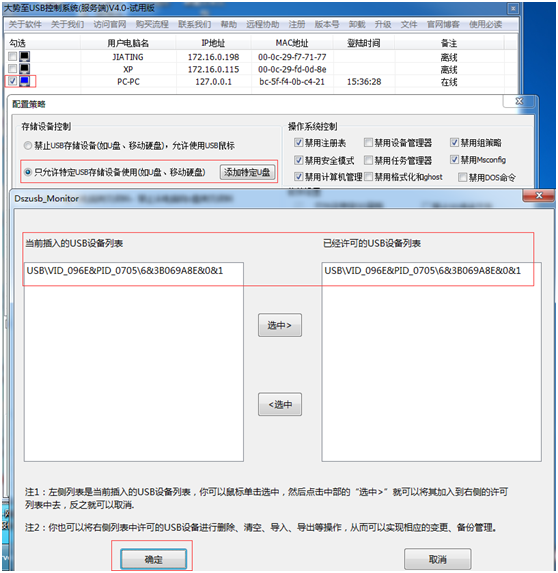 在“大势至USB控制软件”的“存储设备控制”这里,勾选“只允许特定USB存设备使用(如U盘、移动硬盘),然后点击后面的“添加特定U盘”,然后会弹出一个对话框”,并且在左侧框内会出现您当前网银的U盾ID情况,鼠标单击选中,并点击中间的“选中”按钮,则就会将当前网银的U盾添加到右侧的“已经许可的USB设备”里面,如下图所示: