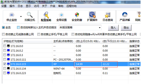 目前国内类似的局域网网速控制软件很多,例如有一款“聚生网管”(下载地址:http://www.grablan.com/wangguan.html),只需要在公司局域网一台电脑安装之后,就可以扫描到局域网内所有上网的设备,可以实时查看各个电脑带宽占用情况,并可以实时控制各个电脑网速,对于手机、平板电脑等同样可以和电脑一样进行控制。如下图所示: