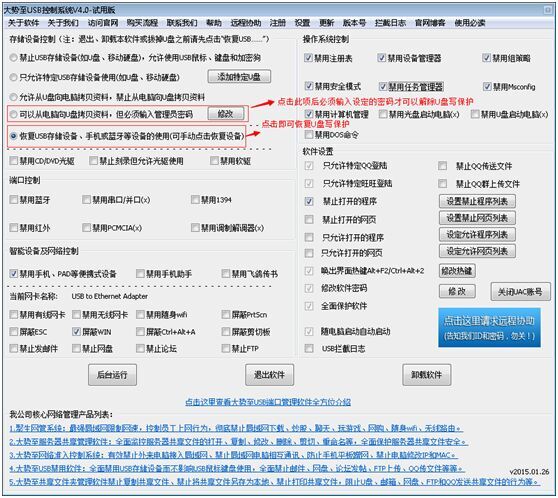 第三、如果你想更简单,就用专门的电脑U盘写保护解除软件来实现,例如有一款“大势至USB接口管理软件”(下载地址:http://www.grablan.com/monitorusb.html),只需要勾选“恢复电脑USB存储设备、手机和蓝牙的使用”即可成功解除U盘写保护功能(如下图所示);同时,还可以对去除U盘写保护进行密码加密,也就是必须输入密码才可以解除U盘写保护,从而进一步保护了U盘的安全,也可以防止特定情况下复制电脑文件到U盘的行为。此外,本软件还可以有效禁止U盘使用、屏蔽USB存储设备以及防止通过发邮件、网盘、FTP上传和QQ发送文件等方式将电脑文件发送出去的行为,全面保护了电脑文件的安全。如下图所示: