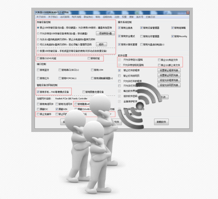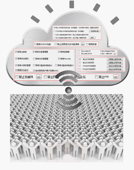 进而,随着大势至USB端口管理软件的用户不断增多,不断有用户提出各种各样的网络管理需要,例如:禁止修改注册表、禁止修改组策略、禁止修改设备管理器、禁止修改开机启动项、禁止开机按F8键进入操作系统的安全模式、禁止PE盘启动电脑、禁止光驱启动电脑等;同时,一些用户还想实现只让电脑运行某些程序、只让电脑访问某些网站,甚至只让电脑登陆特定QQ号、只让电脑登陆指定阿里旺旺账号等等。因此,大势至公司研发团队又进一步推出了大势至禁用U口软件V4.1版本,集成了上述网络控制功能,如下图所示: