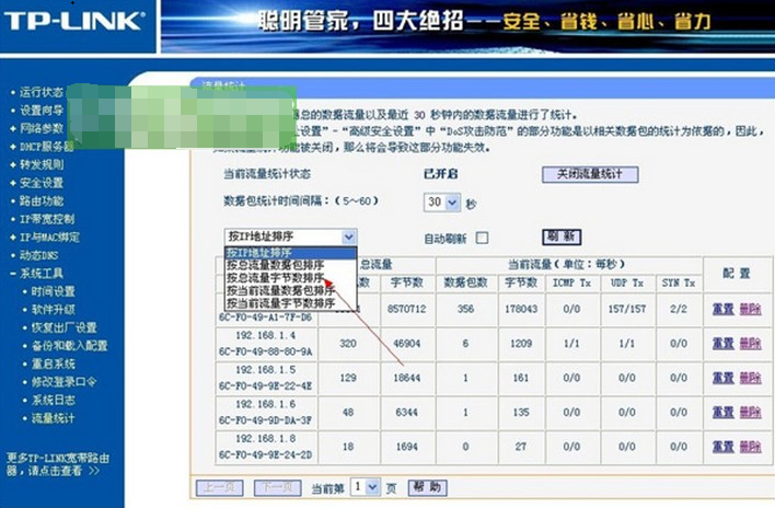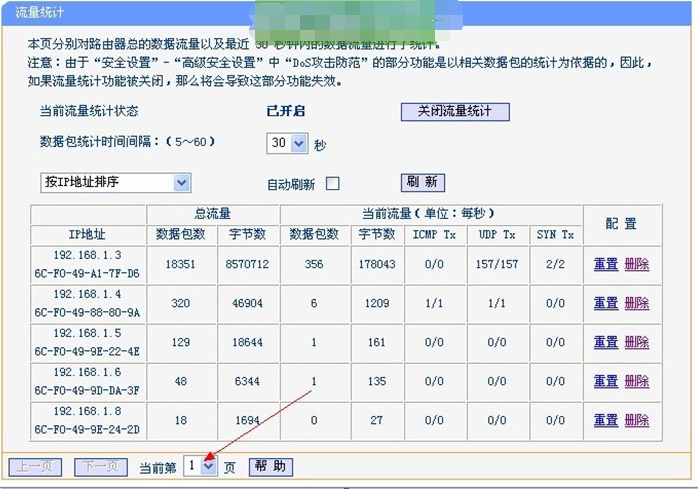 5、点击完开启后,点下面的刷新铵钮,这样就会出现你网络中正在使用的IP地址和流量使用情况了。我们一般从数据包中看流量的使用大小(如图)如果流量超过5位数就比较大了。