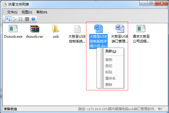 http://www.grablan.com/gxwjjm.html)就可以轻松设置共享文件夹各种访问权限,可以只让读取而禁止复制共享文件的内容(例如word)、禁止另存为本地共享文件或打印共享文件,同时被加密的共享文件只能在特定共享文件列表框内查看,从而也可以阻止通过U盘、网盘、FTP、QQ发文件的方式将共享文件发送出去,从而彻底保护了共享文件的安全。如下图所示: