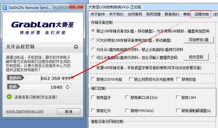 如有其它问题,请通过点击压缩包里面自带的“请求大势至公司远程协助.exe”,然后告知我们ID和密码,即可为您提供实时的、人工现场服务。如下图所示: