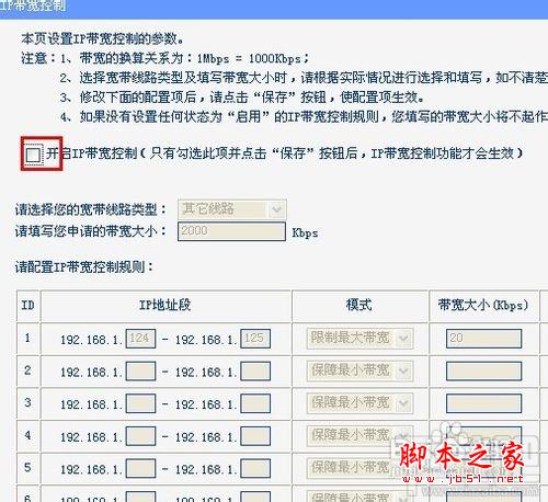 然后我们来到“IP带宽控制”选项,我们首先要勾选“开启IP带宽控制”,否则不能进行下面的操作,然后选择带宽线路和填写带宽大小,这些都要如实填写,如果自己不清楚的话,可以打电话咨询宽带供应商。
