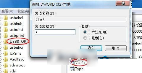 USB设备禁用方法二:在Windows 7系统中,运行注册表编辑器,依次展开到HKEY_LOCAL_MACHINE/SYSTEM/CurrentControlSet/services/USBSTOR,在右侧窗口中找到并双击“Start”,然后在弹出的窗口中,将其默认值修改为“4”。