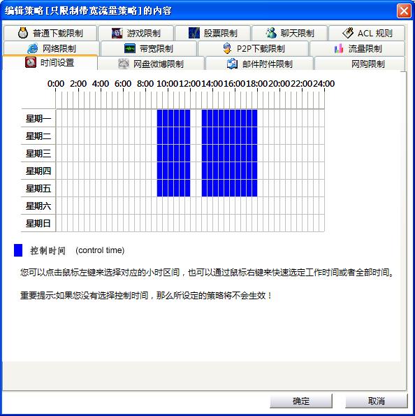 然后我们需要设置让这个禁止上网的策略生效的时间,点击“时间设置”,鼠标单击小方格(半小时)为蓝色则代表控制时间,白色代表非控制时间。如下图所示: