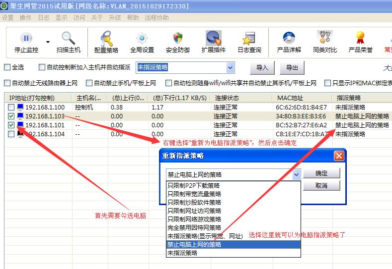 至此,我们就成功为电脑指派了策略,这样当时间到了蓝色区域则禁止电脑上网的策略就生效了,就自动控制电脑上网时间了。一旦控制时间过去之后,就自动可以上网了。同时,通过聚生网管软件还可以禁止电脑P2P下载、禁止在线玩游戏、禁止炒股等不合理的上网行为,从而进一步加强电脑使用控制,防止滥用电脑的行为了。如下图所示: