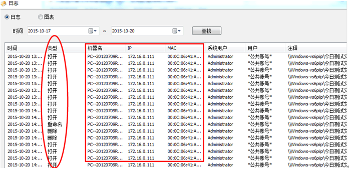 日志记录的内容包括操作类型,例如打开、编辑、删除、打印等等,还包括操作时间、用户ip、用户mac地址、用户电脑的账户名称、操作的文件夹和文件名称等。一旦发现有人非法使用公司这些重要机密文件,可以及早地制止,把损失降到较小,同时这些记录也是较有力的证据。如图所示: