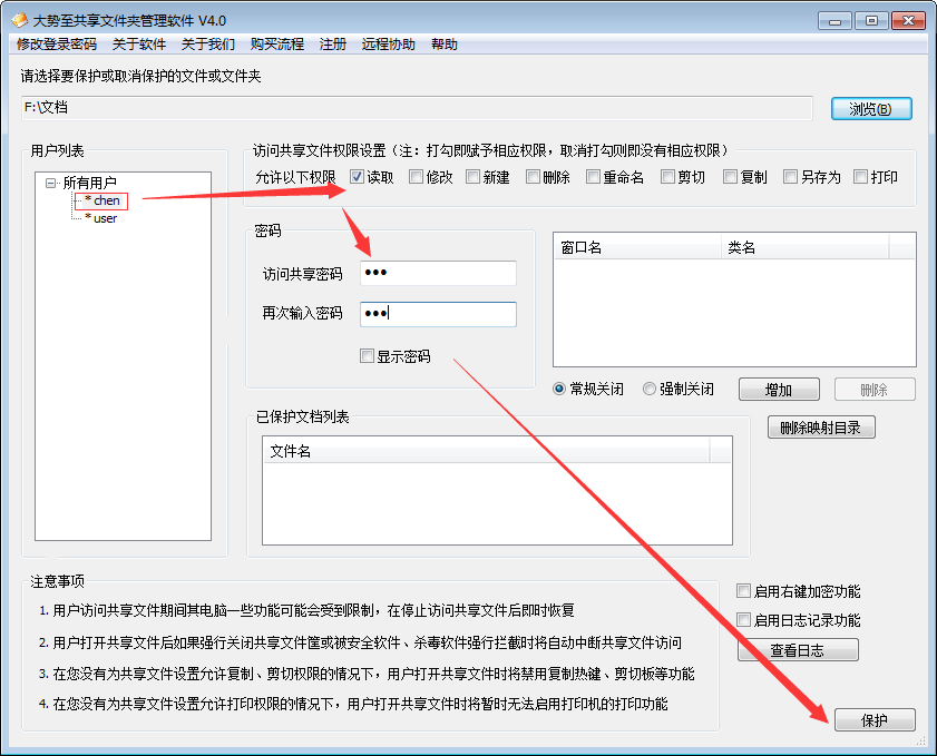 然后,在顶部的“请选择要保护的或取消保护的文件或文件夹”下面的框框后面点击“浏览”,即可选择要保护的共享文件,然后在右侧的“用户列表”这里,鼠标点击要赋予访问权限的用户,然后右侧勾选即可赋予相应的权限,比如“读取”、“修改”、“删除”……等,赋予相应的权限即访问者就可以进行上述操作。较后点击右下角的“保存”按钮,即可成功保护。如下图所示:
