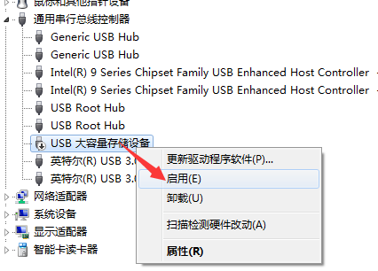 另外需要注意的是,如果这样设置之后网银U盾依然无法使用,这个时候你可以在插入网银U盾的情况下,打开电脑的“设备管理器”(需要先在大势至USB端口管理软件上取消勾选禁用设备管理器才可以打开),然后在“设备管理器”列表中,恢复被禁用的“大容量存储设备”或被禁用的光驱即可。如下图所示: