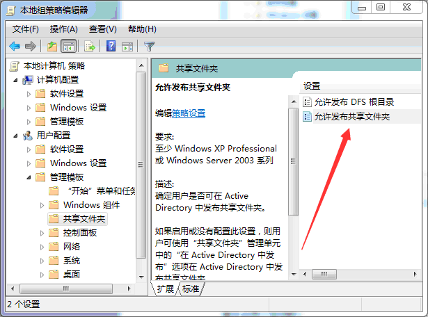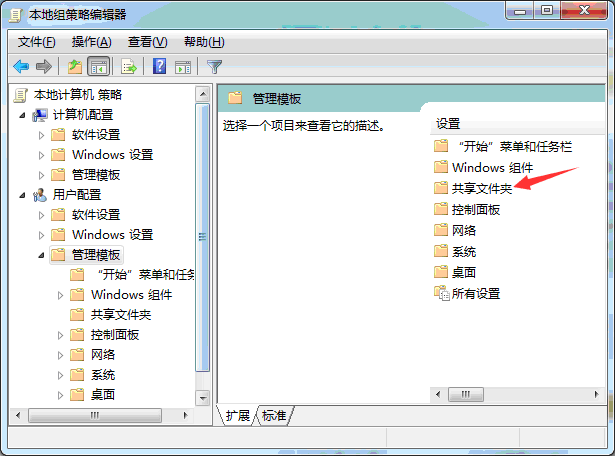 然后打组策略选择本计算机策略“用户配置”右侧窗口的“管理模板”,然后点击“共享文件夹”,如下图所示: