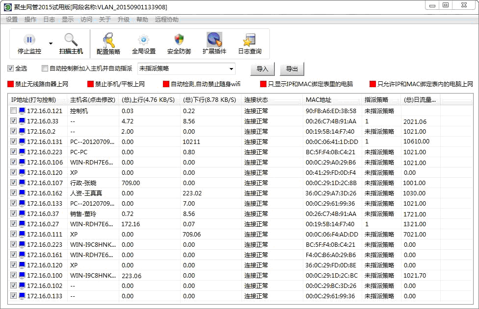 聚生网管这款软件设计的非常人性化,除了以上这些功能,还可以禁止全部的聊天软件或者登陆指定账号、封堵一切游戏软件、限制所有炒股软件、精确控制流量、精确控制带宽、设置网页黑白名单、禁止QQ传文件、禁用网盘、禁止使用邮箱或者使用特定邮箱、禁止登陆微信、记录用户上网记录等等。全部功能都只需点几下鼠标就可以生效,有兴趣的用户不妨下载试用版体验一下。