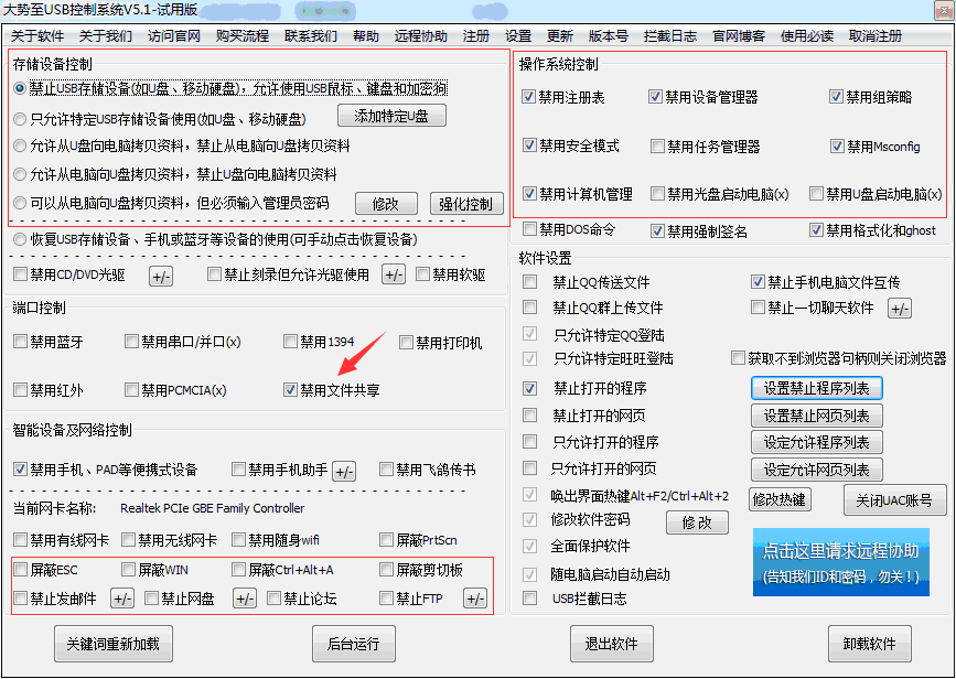 目前,国内有一些电脑文件安全管理软件,集成了对电脑共享文件的管理,可以实时监测、禁用共享文件夹的访问,阻止用户设置共享文件的行为。例如有一款“大势至USB端口管理软件”(下载地址:http://www.grablan.com/monitorusb.html),是一款可以完全禁止电脑使用U盘、移动硬盘和手机等USB存储设备的软件,同时还可以防止通过邮件、网盘、FTP文件上传和QQ发送文件的方式将电脑文件发送出去的行为,从而比较全面地保护了电脑文件安全。大势至USB接口禁用软件集成了一个“禁止文件共享”的功能,只需要打勾即可实时禁止电脑设置共享文件的行为,如下图所示: