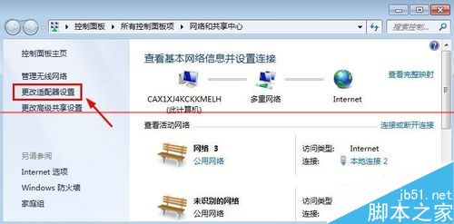 3、网络和共享中心左侧点击打开更改适配器设置。