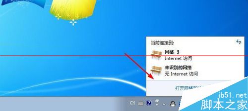 1、我们点击任务栏右下角的网络图标,这里我们要打开网络和共享中心。