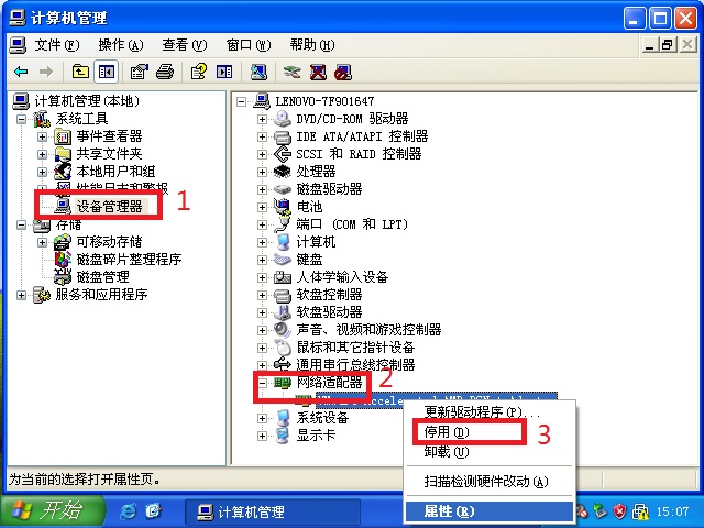 在弹出窗口计算机管理中选择“设备管理器”,查看右侧“网络适配器”,根据BOM中无线网卡型号选择对应的无线网卡(如:BCM、intel或802.11等字样),右键选择该设备单击禁用即可。如下图所示