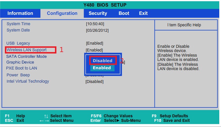 注:若为笔记本,大部分机型可以在BIOS中禁用无线网卡。参考BIOS虚拟页面(下图以Y480BIOS为例):http://10.99.109.13/webtools/