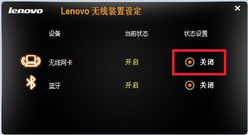 也可以使用快捷键:Fn+F5,将无线网卡状态选为“关闭”也可禁用无线网卡,如下图所示: