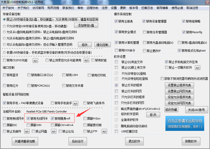 如果你想实现更为严密和有效的禁用USB无线网卡的功能,则可以借助于一些专门的网络控制软件、电脑使用管理软件来实现。例如有一款“大势至USB禁用软件”(下载地址:http://www.grablan.com/monitorusb.html),是一款可以完全禁止U盘使用、禁用USB存储工具使用的软件,同时还可以禁止电脑光驱刻录、禁止蓝牙、禁用手机存储卡等,以及禁止电脑发送邮件附件、禁止网盘上传电脑文件、禁止QQ发送文件以及禁止FTP文件上传等,全面保护电脑文件安全,防止通过各种途径泄密的行为。大势至USB控制软件集成了一个“禁用无线网卡”和“禁用随身wifi”的功能,用户只需要勾选就可以实时、精准禁用无线网卡的使用,以及禁用随身wifi的使用,全面规范员工使用电脑的行为,防止网络不适当扩展,滥用公司网络资源的行为。如下图所示: