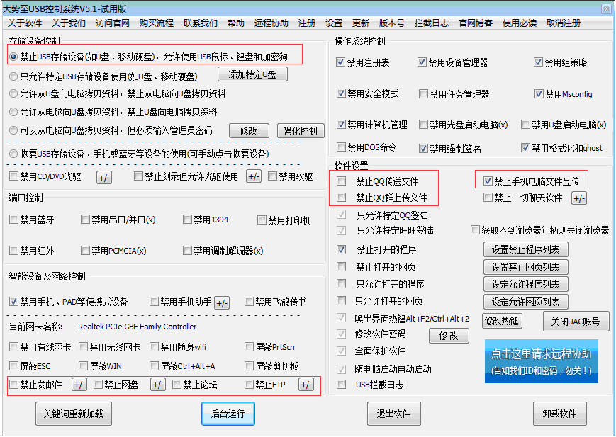 这种情况下,可以考虑部署第三方专门的电脑安全管理软件来实现。例如有一款“大势至USB端口管理软件”(下载地址:http://www.grablan.com/monitorusb.html),是一款可以完全禁止U盘、禁用移动硬盘、禁用USB存储设备而不影响USB鼠标键盘、加密狗和U盾使用的电脑安全管理软件,同时还可以禁止电脑发送邮件附件、禁止网盘上传电脑文件、禁止QQ发送文件以及禁止FTP传输文件等,从而可以完全阻止通过主流的网络途径泄露电脑机密文件的行为。如下图所示: