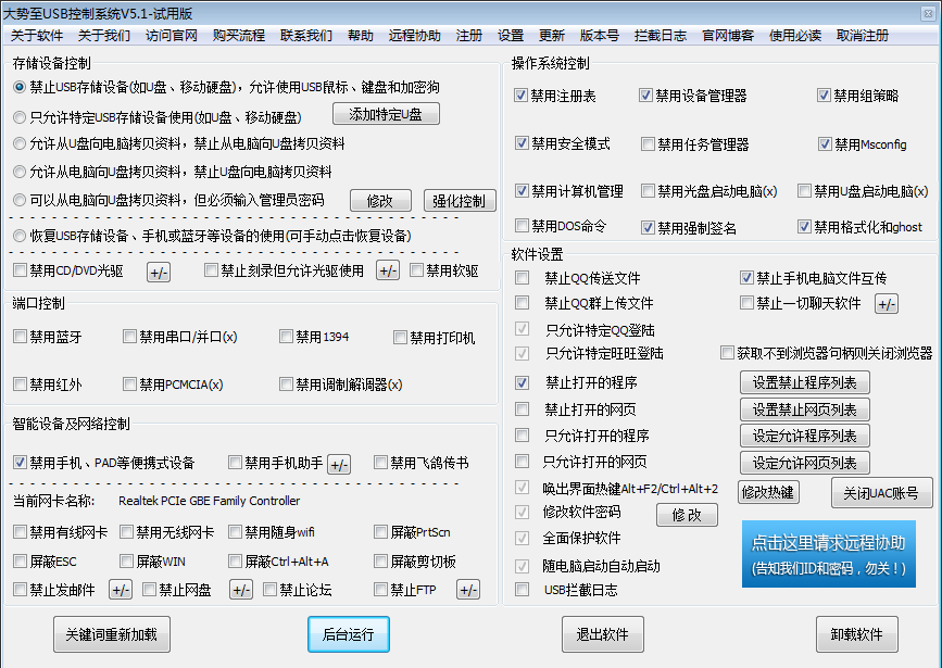 同时,企业也要严防内鬼,据第三方调查,很多企业泄密事件的发生都是由企业内部员工窃取的。这是因为,员工工作中都会用到电脑,工作中形成的劳动成果、重要文件也大都是存储在自己的电脑上,这使得员工可以轻松通过U盘、邮件、网盘、FTP文件上传以及QQ发送文件的方式将电脑文件发送出去,从而使得单位的无形资产和商业机密被泄露。为此,我们也需要加强对单位内部电脑使用的控制。这可以部署第三方的网络控制软件,例如有一款“大势至USB控制系统”(下载地址:http://www.grablan.com/monitorusb.html),只需要在电脑安装部署之后,就可以完全禁用U盘、移动硬盘和手机等USB存储设备,同时还可以禁止电脑发送邮件、禁止网盘上传电脑文件、禁止QQ发送文件以及禁止FTP文件上传等,从而全面保护电脑文件安全,防止通过各种途径泄密的行为。如下图所示: