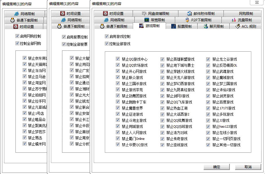 当前,很多路由器、交换机或防火墙或多或少具备了一定的网络行为控制功能,可以实现较为有效的局域网网络行为控制和管理,比如禁止员工炒股、禁止电脑玩游戏、禁止员工上班网购、禁止在线看视频以及禁止P2P下载等行为,同时设置也较为简单,如下图所示: