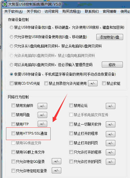 如果你觉得通过路由器禁止HTTPS网站比较复杂,也可以借助第三方软件的方式来禁止。例如有一款“大势至USB端口管理软件”(下载地址:http://www.grablan.com/monitorusb.html)是一款专门禁止USB存储设备、禁用U盘的电脑安全管理软件,同时还可以禁止邮件附件发送、禁止网盘文件上传、禁止QQ发送文件以及禁止FTP发送文件等,可以阻止通过各种途径泄露电脑文件的行为。