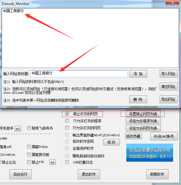如果你想只让访问某些HTTPS的网站,则只需要在大势至USB控制系统的“禁止打开的网页”里面,添加允许访问的网站中文名称即可。如“中国工商银行”,则就只可以打开工商银行的HTTPS网站了。如下图所示: