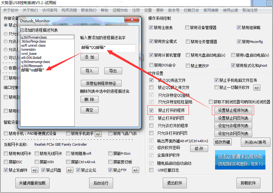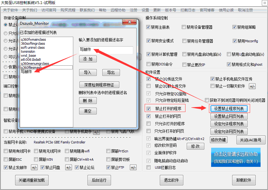 这需要借助于大势至USB控制系统集成的程序例外机制(也即白名单程序)来实现。具体如下: