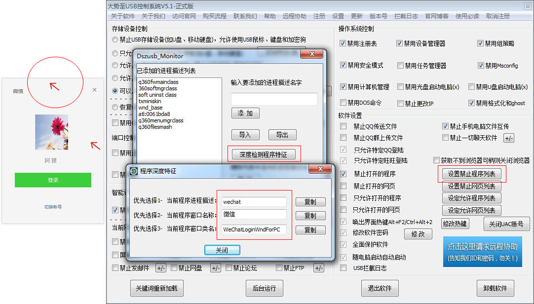 通过快捷键唤出软件界面,勾选“禁止打开的程序”,点击“设置禁止程序列表”。在弹出的窗口中输入关键词,例如“微信”,添加至左侧列表,然后关掉此窗口,即刻生效,那么再次打开微信程序或安装微信程序,界面就会立刻关闭。如下图所示: